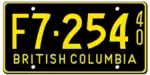 1940 | Embossed yellow serial on black plate with border line; "BRITISH COLUMBIA" at bottom and vertical "40" at right | none | 12-345 | 1 to 99-999 | 'A' prefix serials were issued from Vancouver Island, 'B' prefixes from Vancouver, and 'F' prefixes from New Westminster. This practice continued through 1947.[3] |