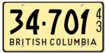 1943 | Embossed black serial on cream plate with border line; "BRITISH COLUMBIA" at bottom and vertical "43" at right | none | 12-345 | 1 to 99-999 | Restamped and repainted 1942 plates. |