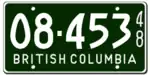 1948 | Embossed white serial on green plate with border line; "BRITISH COLUMBIA" at bottom and vertical "48" at right | none | 12-345 | 1 to 99-999 | |
