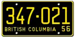 1956 | Embossed golden yellow serial on black plate with border line; "BRITISH COLUMBIA 56" at bottom | none | 123-456 | 1 to approximately 352-000 | |