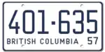 1957 | Embossed dark blue serial on white plate with border line; "BRITISH COLUMBIA 57" at bottom | none | 123-456 | 1 to approximately 402-000 | |