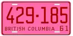 1961 | Embossed maroon serial on pink plate with border line; "BRITISH COLUMBIA 61" at bottom | none | 123-456 | 1 to approximately 471-000 | |