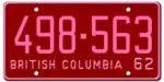 1962 | Embossed pink serial on maroon plate with border line; "BRITISH COLUMBIA 62" at bottom | none | 123-456 | 1 to approximately 509-000 | |