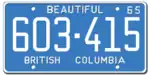 1965 | Embossed white serial on blue plate with border line; "BRITISH COLUMBIA" centred at bottom; "65" at top right | "BEAUTIFUL" centred at top | 123-456 | 1 to approximately 630-000 | |