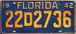 1942–43 | Embossed orange serial on dark blue plate with border line; "FLORIDA" centered at top; "19" at top left and "42" at top right | none | 1T-123 10T-12 1-1234 10-123 1D12345 10D1234 1W12345 10W1234 1WW-123 10WW-12 |
