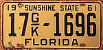 1961 | Embossed navy blue serial on lemon yellow plate with border line; "FLORIDA" centered at bottom; "19" at top left and "61" at top right | "SUNSHINE STATE" centered at top | 1T-12345 10T-1234 1D-12345 10D12345 1-123456 10-12345 1W123456 10W12345 1WW12345 10WW1234 |