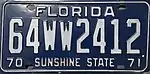 July 1970 – June 1971 | Embossed white serial on blue plate with border line; "FLORIDA" centered at top; "70" at bottom left and "71" at bottom right | "SUNSHINE STATE" centered at bottom | 1D-12345 10D12345 1-123456 10-123456 1W123456 10W12345 10/W-123456 1WW12345 10WW1234 10W/W12345 |