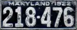 1922 Embossed white serial on dark blue plate with border line; "MARYLAND·1922" centered at top none 123-456 30-000 to approximately 151-000 First use of the full state name.