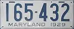 1929 Embossed blue serial on white plate with border line; "MARYLAND 1929" centered at bottom none 123-456 30-000 to approximately 325-000