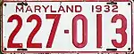 1932 Embossed red serial on white plate with border line; "MARYLAND 1932" centered at top none 123-456 30-000 to approximately 389-000