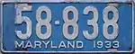 1933 Embossed white serial on blue plate with border line; "MARYLAND 1933" centered at bottom none 123-456 30-000 to approximately 385-000