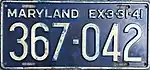 1940–41 Embossed white serial on dark blue plate with border line; "MARYLAND EX-3-31-41" at top none 123-456 30-000 to approximately 544-000