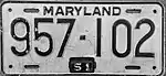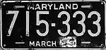 1951–53 Embossed silver serial on black plate with border line; "MARYLAND" and "MARCH 52" centered at top and bottom respectively none 123-456 30-000 to approximately 795-000 Revalidated through March 31, 1953 with white tabs.