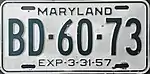 1956–57 Embossed dark green serial on white plate with border line; "MARYLAND" and "EXP-3-31-57" centered at top and bottom respectively none AB-12-34