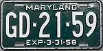 1957–58 Embossed white serial on dark green plate with border line; "MARYLAND" and "EXP-3-31-58" centered at top and bottom respectively none AB-12-34 Letter L added to two-letter series.