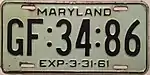 1960–61 Embossed black serial on turquoise plate with border line; "MARYLAND" and "EXP-3-31-61" centered at top and bottom respectively none AB:12:34