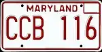 Embossed red serial on white plate; border line around plate and around sticker spot at top right; "MARYLAND" centered at top none ABC 123 AAA 001 to approximately HNB 999