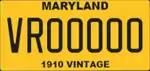 January 1 – December 31, 2014 Embossed black serial on yellow plate with border line; "MARYLAND" screened in black centered at top "1910 VINTAGE" screened in black centered at bottom VR12345 (passenger car)