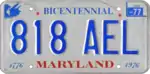December 1975 – February 1977 Embossed blue serial on reflective white plate; blue graphic screened at top left featuring the Fort McHenry cannons; "MARYLAND" screened in red centered at bottom; "1776" and "1976" screened in blue on either side of state name "BICENTENNIAL" screened in blue centered at top, with a red star on either side 123 ABC 001 AAA to approximately 999 AFH Manufactured by Polyvend Inc. of Arkansas. Last issued February 1977, but remained valid through March 31, 1980.