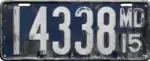1915 Embossed white serial on blue plate; "MD 15" at right none 12345 4000 to approximately 32000