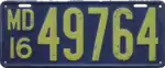 1916 Embossed yellow serial on black plate; "MD 16" at left none 12345 8000 to approximately 51000