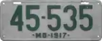 1917 Embossed dark green serial on white plate; "MD·1917" centered at bottom none 12-345 20-000 to approximately 82-000