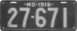 1918 Embossed white serial on dark gray plate; "MD·1918" centered at top none 12-345 20-000 to approximately 95-000