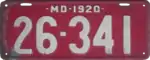 1920 Embossed white serial on red plate; "MD·1920" centered at top none 123-456 20-000 to approximately 113-000