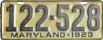 1923 Embossed black serial on yellow plate with border line; "MARYLAND·1923" centered at bottom none 123-456 30-000 to approximately 185-000