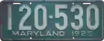 1925 Embossed white serial on green plate with border line; "MARYLAND 1925" centered at bottom none 123-456 30-000 to approximately 242-000