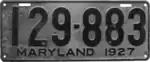1927 Embossed black serial on white plate with border line; "MARYLAND 1927" centered at bottom none 123-456 30-000 to approximately 288-000