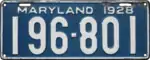 1928 Embossed white serial on blue plate with border line; "MARYLAND 1928" centered at top none 123-456 30-000 to approximately 305-000