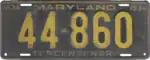 1944–47 Embossed silver serial on black plate with border line; "MARYLAND" centered at top; "3-31" at top left and "1945" at top right "DRIVE CAREFULLY" centered at bottom 123-456 30-000 to approximately 688-000 Revalidated through March 31, 1946 with silver tabs, then through March 31, 1947 with yellow tabs.