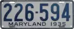 1935 Embossed dark blue serial on white plate with border line; "MARYLAND 1935" centered at bottom none 123-456 30-000 to approximately 381-000