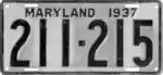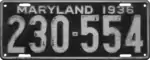 1937–38 Embossed black serial on white plate with border line; "MARYLAND 1937" centered at top none 123-456 30-000 to approximately 409-000