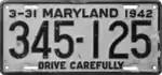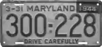 1941–44 Embossed black serial on silver plate with border line; "MARYLAND" centered at top; "3-31" at top left and "1942" at top right "DRIVE CAREFULLY" centered at bottom 123-456 30-000 to approximately 654-000 Revalidated through March 31, 1943 with yellow tabs, then through March 31, 1944 with black tabs, due to metal conservation for World War II.