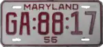 1955–56 Embossed red serial on white plate with border line; "MARYLAND" and "56" centered at top and bottom respectively none AB:12:34