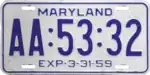 1958–59 Embossed blue serial on white plate with border line; "MARYLAND" and "EXP-3-31-59" centered at top and bottom respectively none AB:12:34