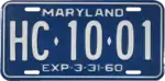 1959–60 Embossed white serial on blue plate with border line; "MARYLAND" and "EXP-3-31-60" centered at top and bottom respectively none AB♦12♦34
