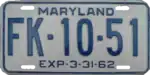 1961–62 Embossed blue serial on white plate with border line; "MARYLAND" and "EXP-3-31-62" centered at top and bottom respectively none AB-12-34 AA-10-01 to approximately FY-47-00 Letters M through Z (excluding O, Q and U) added to two-letter series. The practice of not using I, O, Q and U in standard passenger serials continues today.[6]