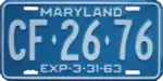 1962–63 Embossed white serial on blue plate with border line; "MARYLAND" and "EXP-3-31-63" centered at top and bottom respectively none AB♦12♦34 AA♦10♦01 to approximately FN♦98♦00