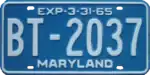 1964–65 Embossed white serial on blue plate with border line; "EXP-3-31-65" and "MARYLAND" centered at top and bottom respectively none AB-1234 AA-1001 to approximately GF-1300