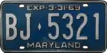1968–69 Embossed white serial on blue plate with border line; "EXP-3-31-69" and "MARYLAND" centered at top and bottom respectively none AB♦1234 AA♦1001 to approximately HT♦5900