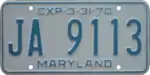 1969–70 Embossed blue serial on white plate with border line; "EXP-3-31-70" and "MARYLAND" centered at top and bottom respectively none AB 1234 AA 1001 to approximately JB 9300