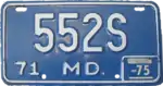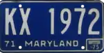 Embossed white serial on blue plate; border line around plate and around sticker spot at bottom right; "MARYLAND" centered at bottom; "71" at bottom left none AB 1234 AA 1001 to approximately SC 4300