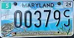 October 29, 2018[14] – present Embossed black serial on reflective graphic plate featuring cloudy blue sky, blue sea, seabed, the Chesapeake Bay Bridge and a Chesapeake blue crab at left and seagrass at bottom right; "MARYLAND" screened in black centered at top "Protect the Chesapeake" screened in white centered at bottom 12345C/A 50001C/H to 08108C/K (as of January 17, 2021) Awarded "Plate of the Year" for best new license plate of 2018 by the Automobile License Plate Collectors Association, the second time Maryland was so honored. Same serial formats used for passenger and multi-purpose vehicles.