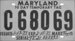 1967–68 Embossed blue serial on white plate with border line; "EXP-3-31-68" and "MARYLAND" centered at top and bottom respectively none AB-1234 AA-1001 to approximately HG-8000