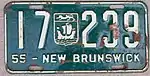 1955 | Embossed white serial on green plate with border line; embossed provincial shield used as separator; "55 – NEW BRUNSWICK" at bottom | none | 12-345 | 1-000 to approximately 79-000 | |