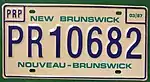 1986 | Embossed blue serial on reflective white plate; border lines around plate and around top corners; "NEW BRUNSWICK" and "NOUVEAU-BRUNSWICK" screened in turquoise centred at top and bottom respectively | none | PR12345 | PRP Plan | |