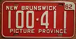 1962–63 | Embossed white serial on red plate with border line; "NEW BRUNSWICK" at top, offset to left; embossed white box at top right containing debossed "62" | "PICTURE PROVINCE" centred at bottom | 123-456 | 1-000 to approximately 152-000 | |